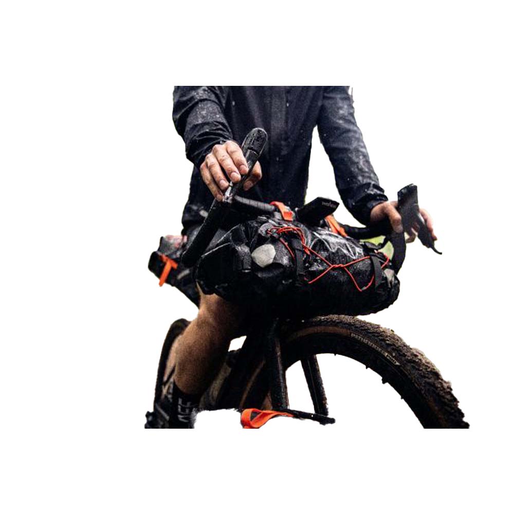 It also helps to secure a balanced distribution of gear and weight across your bike. Thanks to the roll closures at both ends, you can always gain quick access to your gear. Compression belts on the outside enable the stowing and attachment of additional equipment. Moreover, the Handlebar-Pack comes with four hooks to enable the attachment of an Ortlieb Accessory-Pack for additional stowage space. Consisting of spacers and two strong Velcro straps, the mounting system ensures secure attachment to any handlebar type, including carbon handlebars. The pack’s stiffened interior and head-tube attachment offer additional stability – in any terrain.