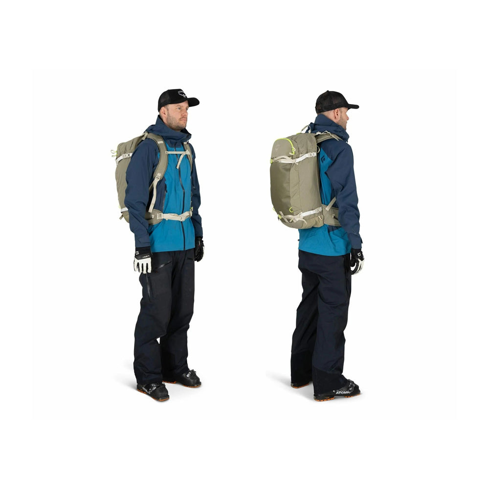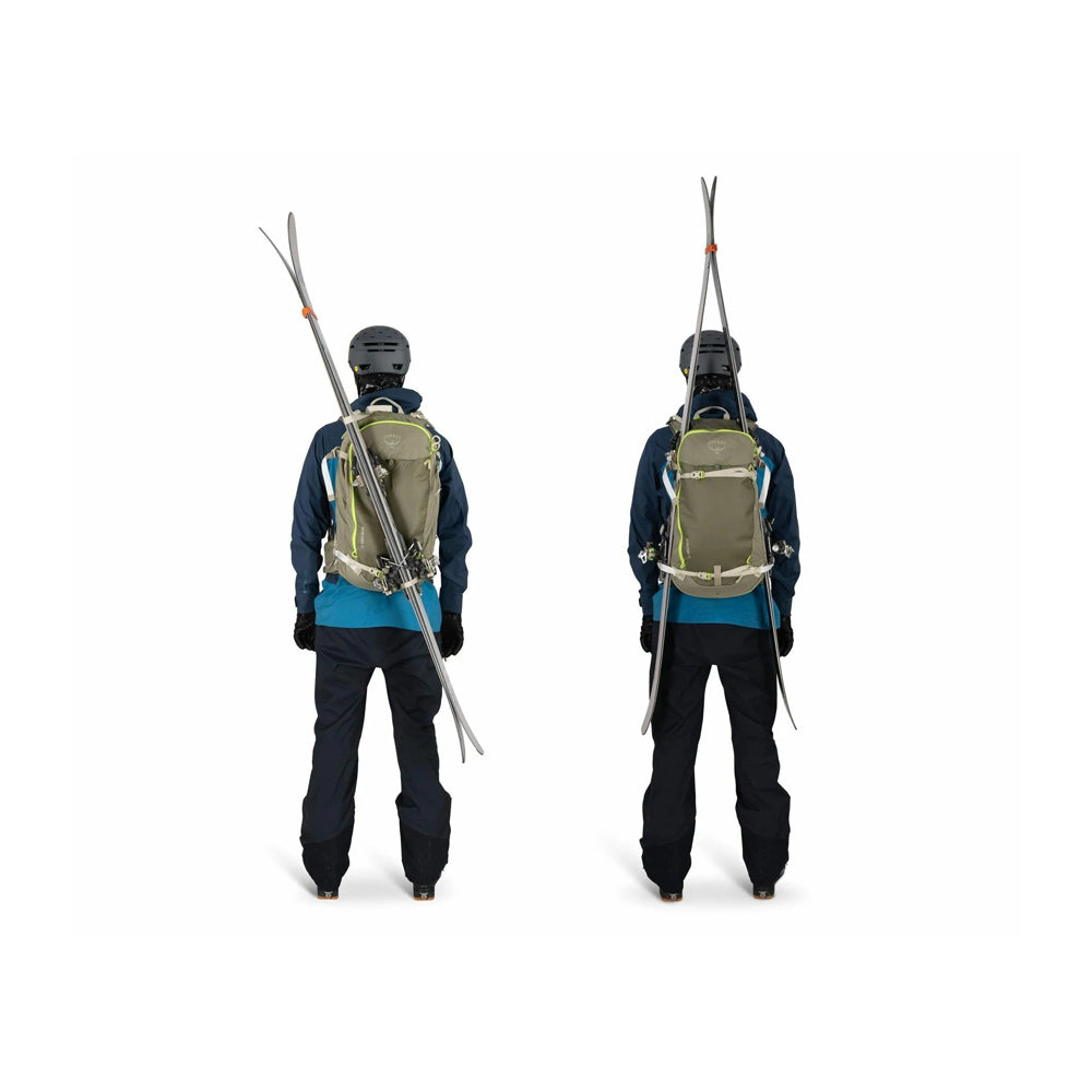 Equipped with a snow-shed backpanel, diagonal and A-frame ski carry, snowboard carry, ice tool attachment and intuitive access to safety avalanche gear.
