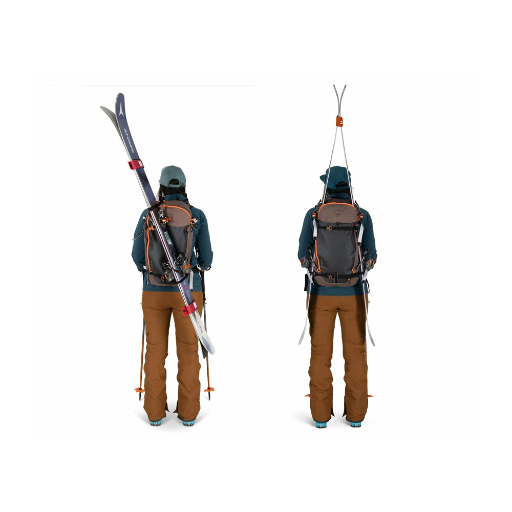 Equipped with a snow-shed backpanel, diagonal and A-frame ski carry, snowboard carry, ice tool attachment and intuitive access to safety avalanche gear.
