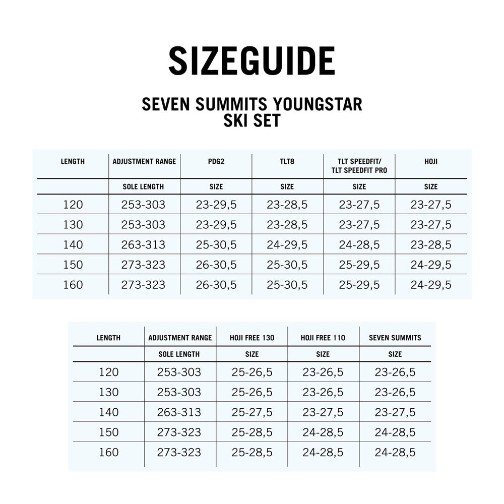 The Youngstar Ski Set with touring skis, binding and skins is pre-mounted and a perfectly coordinated set for kids and youth. DYNAFIT ski touring sets make the activity of ski touring even simpler and less complicated. With the Youngstar Ski Set, the next generation is the focus to ensure the while family is geared up and can in the future head out on ski tours together. The complete package includes the Youngstar touring ski, the Rotation 7 binding, and the coordinating Youngstar ski touring skins. It doesn’t get any simpler: Order your package, unpack it, have your bindings adjusted by an authorized professional, and off you go to the slopes. The ski is a true all-rounder and was developed especially for next-gen ski tourers. It is already available in sizes starting at 120 cm. With an extra soft flex, this ski is well suited for kids and youth and easy to handle. With its low weight, the youngsters can save energy on climbs so they have enough power left for the descent. The full ABS sidewalls guarantee the best possible power transfer to the ski – whether on-piste or in the backcountry. No matter where you head, with the youngstar, the kids are ideally equipped for all snow conditions and any kind of terrain. Compared to DYNAFIT’s other ski models, the Youngstar’s extended turning radius makes the ski very forgiving. At the same time, the full wood core of poplar lends the necessary pop and a smooth chatter-free ride. The rocker construction at the tip and tail and the sidecut are also adapted for each ski size – a unique feature in the ski touring market. This keeps the effective edge length equally proportional to each size, allowing it to function independent of the size. Complementing the ski is the impressive Rotation 7 with its patented pivoting toe piece as the only safety binding for kids and youth that is based on the superlight Low Tech System. The pivoting toe piece evens out impacts that can effect ski and binding on a powerful dynamic downhill. The binding release function is thus more reliable and effectively counters unwanted early release. The ST Rotation 7 binding offers 25 mm of flex in its length adjustment, huge comfort thanks to three walk modes, and can be adjusted to a low release value of DIN 2.5 to 7 – a unique feature on the market for safety and reliability of the highest level. As with all DYNAFIT bindings, the Rotation 7 has been developed and manufactured in Germany and offers DYNAFIT’s Lifetime Guarantee. The set is rounded out with the Youngstar ski skins. These have been made in Switzerland with the familiar POMOCA quality, offering ideal grip and glide characteristics. Youngstar Ski Set – The all-round carefree package for the next generation.